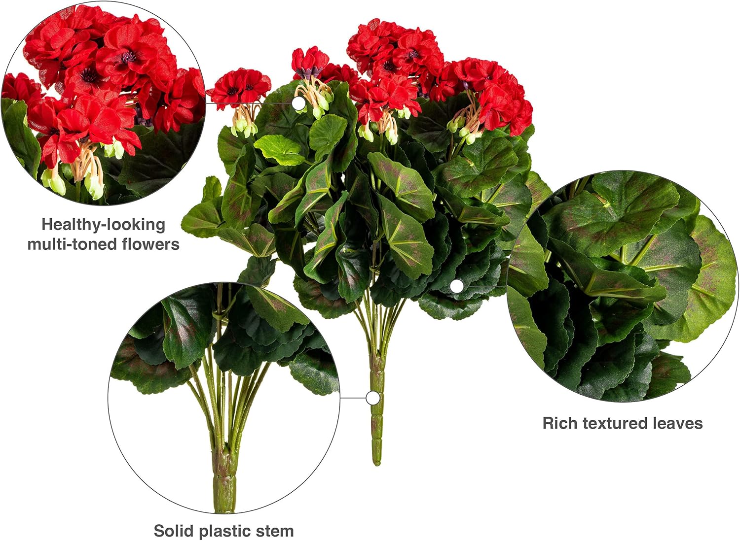 Vickerman 17. 5" Artificial Red Polyester Geranium Bush. Bring a touch of nature into your home with the 17. 5-inch Red Geranium Bush by Vickerman. This beautiful artificial flower spray boasts 12 geranium flower heads in a rich red hue, surrounded by verdant green leaves. The lifelike blooms and foliage create a realistic and charming addition to any indoor decor. Perfect for indoor use, these maintenance-free faux flowers are easy to keep looking fresh with just a quick wipe of a dry cloth. Arrange these faux geraniums in any decorative container for a unique floral arrangement to add a touch of nature to your home or office decor. These indoor flowers are designed to withstand the elements and maintain their vibrant color. Bring a touch of nature into your home with this lifelike geranium bush. Place them in your living room, bedroom or office space. For additional complimentary accents see the many wreaths and garlands available from Vickerman. Vickerman has been an industry leader in quality, design and manufacturing since 1940.